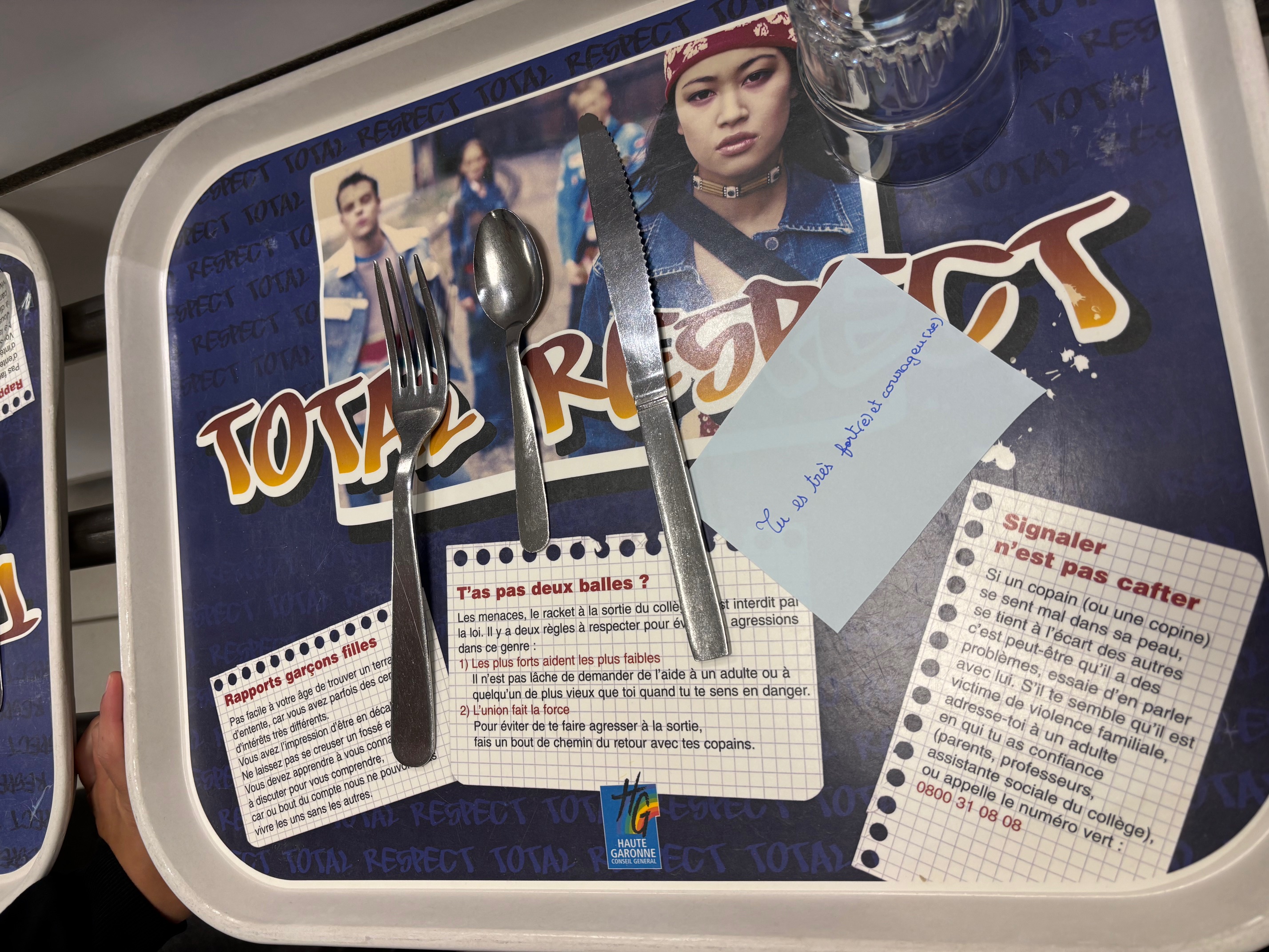Sur le temps de restauration, ils ont mené une action originale : des mots positifs et bienveillants, rédigés par leurs camarades sur le temps d'étude, ont été distribués par surprise aux élèves du self.