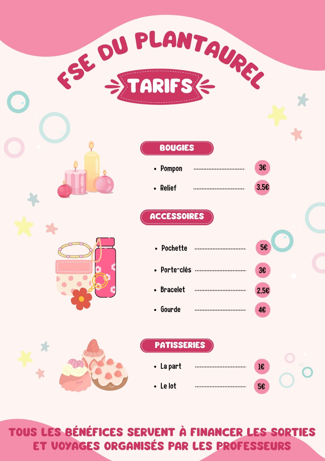 Dans le but de financer les différents projets de l’année, le FSE tiendra un petit stand de vente d’objets (bijoux, bougies, autres accessoires…) et de gâteaux le soir de chacune des réunions parents-professeurs.